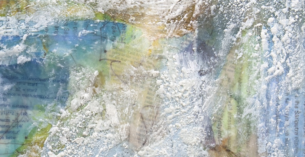 Added more paint and layers. Painted with encaustic. Finally covered with the white. Detail 1 of “Where Are You Going?” Misako OBA Sutra after encaustic.